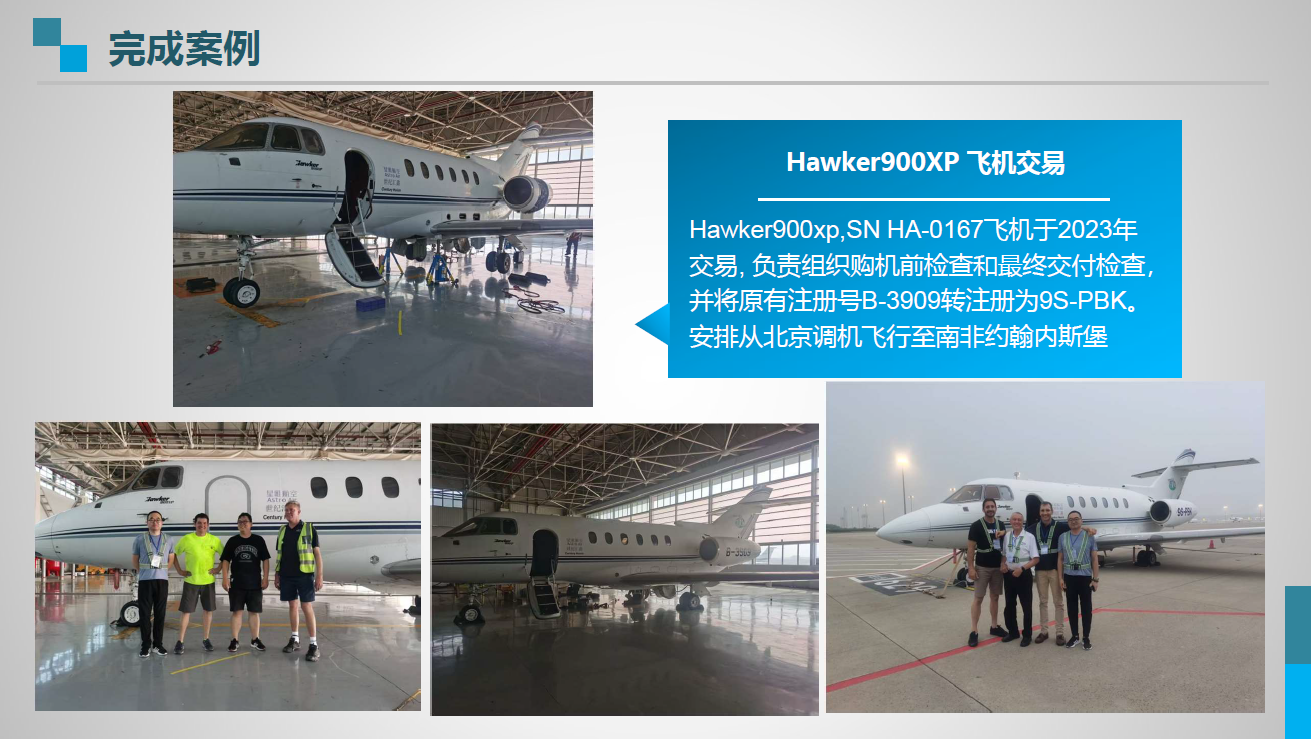 Hawker900xp,SN HA-0167飞机于2023年交易, 负责组织购机前检查和最终交付检查,并将原有注册号B-3909转注册为9S-PBK。安排从北京调机飞行至南非约翰内斯堡