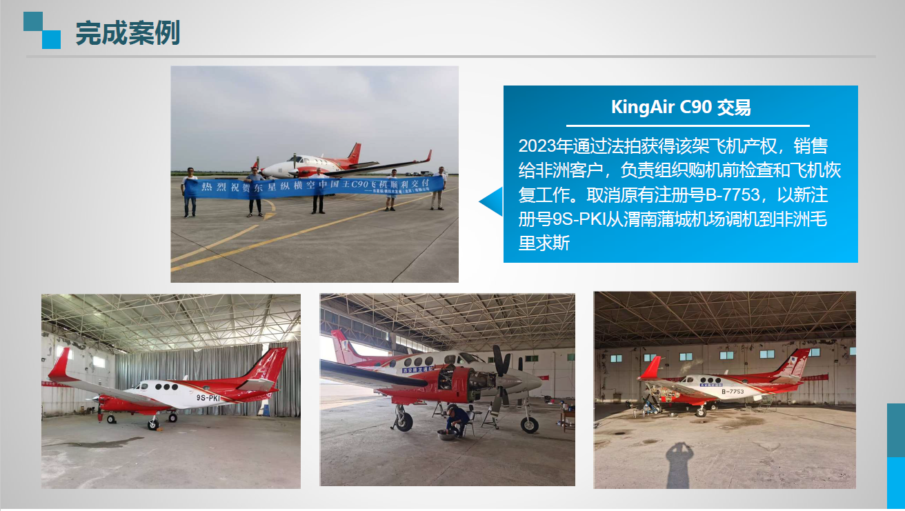 2023年通过法拍获得该架飞机产权,销售给非洲客户,负责组织购机前检查和飞机恢复工作。取消原有注册号B-7753,以新注册号9S-PKI从蒲城内府机场调机到非洲毛里求斯